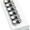 Set of six locking tuners designed to fit most modern-style Fender electric guitars with dual-pin mounting configuration. Tall post tuners are used for the wound strings and shorter post tuners are used for the plain strings. Staggered tuners increase the break angle over the nut and improve tuning stability.