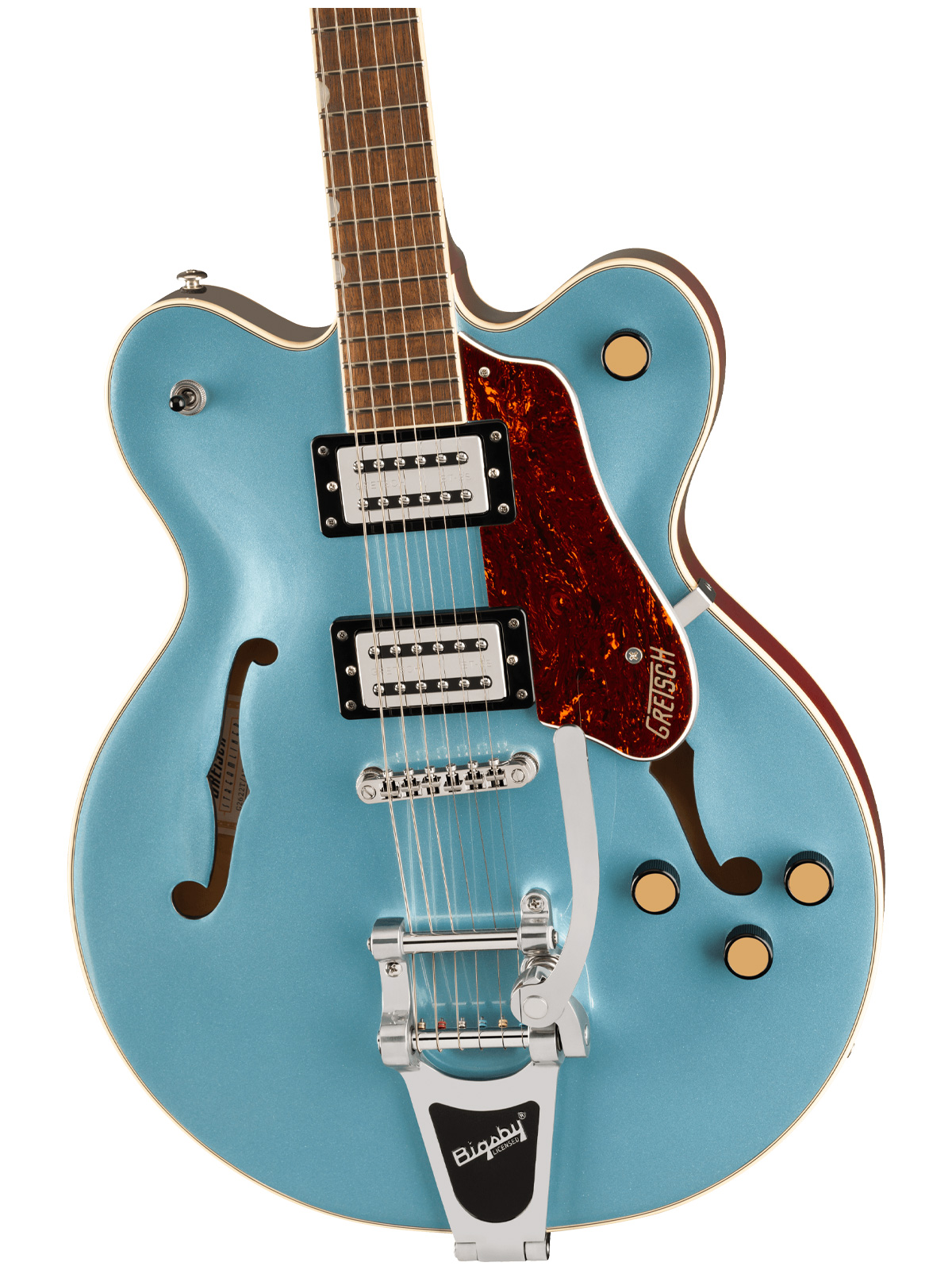The G2622T Streamliner Center Block Double-Cut with Bigsby® bursts into the modern era with powerful sound and style. The sleek G2622T is designed for the guitarist who demands more than the mundane from an instrument – more performance, more style and most importantly, more volume – while retaining everything you expect from a Gretsch.